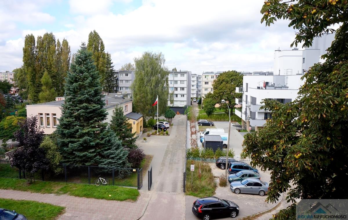 Blok po termomodernizacji, zadbany teren wokół, dużo zieleni, blisko duży parking przy bloku.